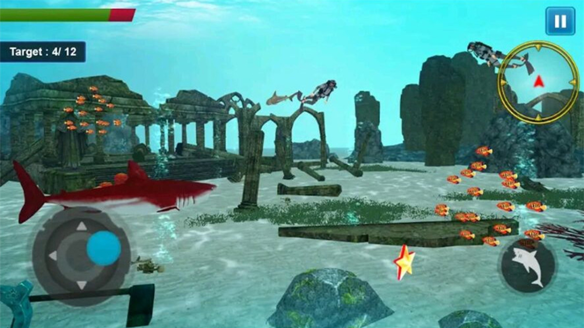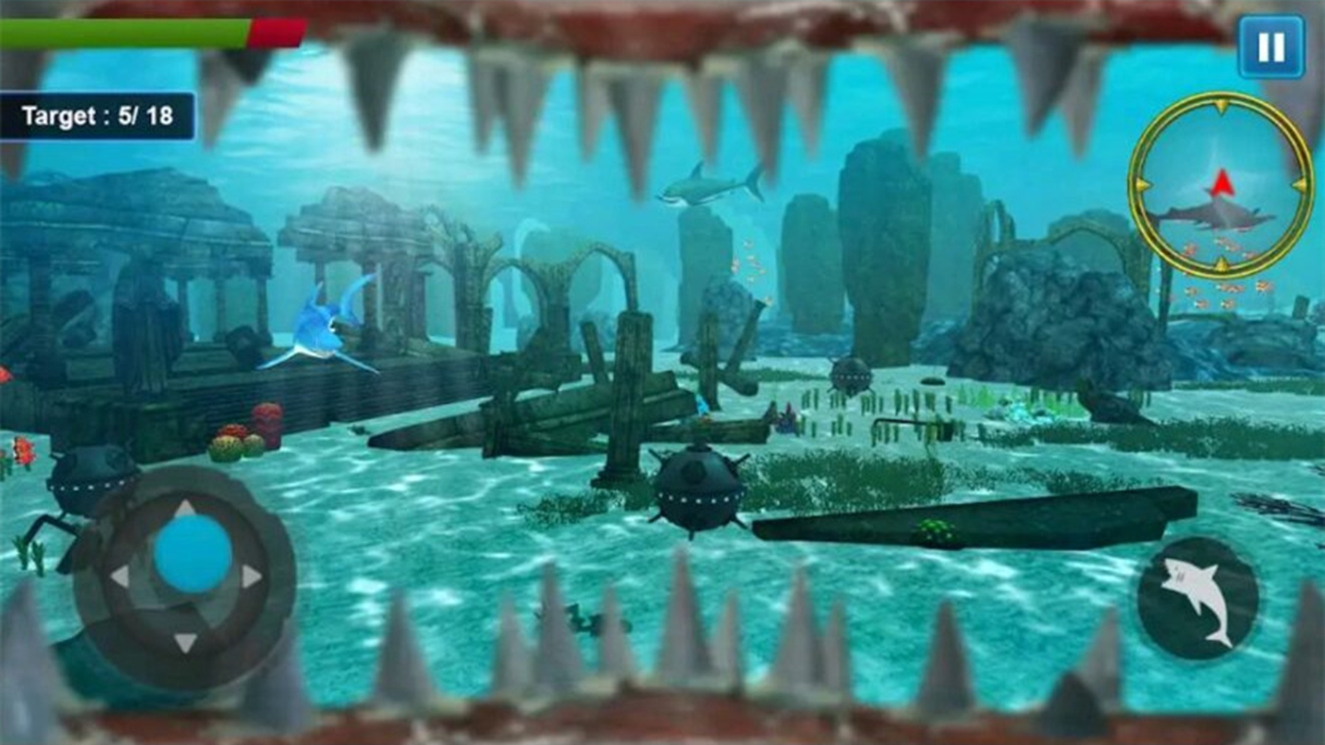 游戏采用直观的双摇杆操控系统,左侧虚拟摇杆控制移动方向,前推前进后拉后退,左右滑动实现转向。右侧摇杆则负责3D视角的旋转,让你可以全方位观察海底环境。屏幕右侧还设有特殊动作按钮,包括冲刺加速、撕咬攻击和吞食猎物等关键操作。游戏支持自定义按键布局,玩家可以根据个人习惯调整操作方式。此外,还加入了智能锁定系统,可以自动追踪附近的猎物,让捕食更加精准高效。