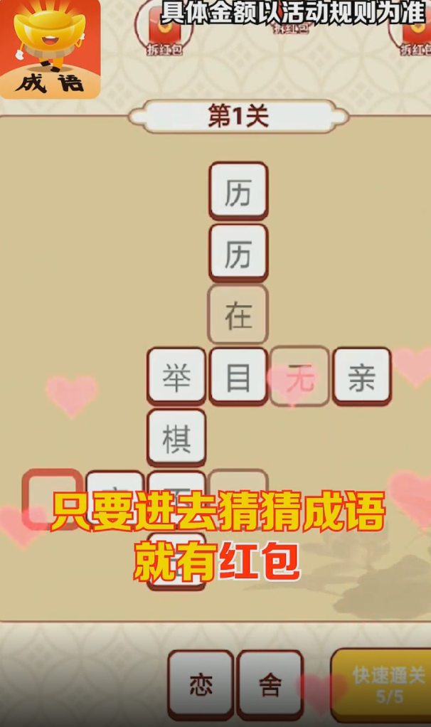 新玩家注册登录即可领取新人红包,完成新手任务还能获得额外奖励。游戏采用高度自由的玩法设计,玩家可以随时随地开启挑战,利用碎片时间轻松赚取红包。开发团队会定期更新游戏内容,不断增加新的关卡和玩法模式,确保玩家始终能体验到新鲜有趣的游戏内容。游戏还特别设置了成语学习功能,帮助玩家在娱乐中提升成语知识水平。