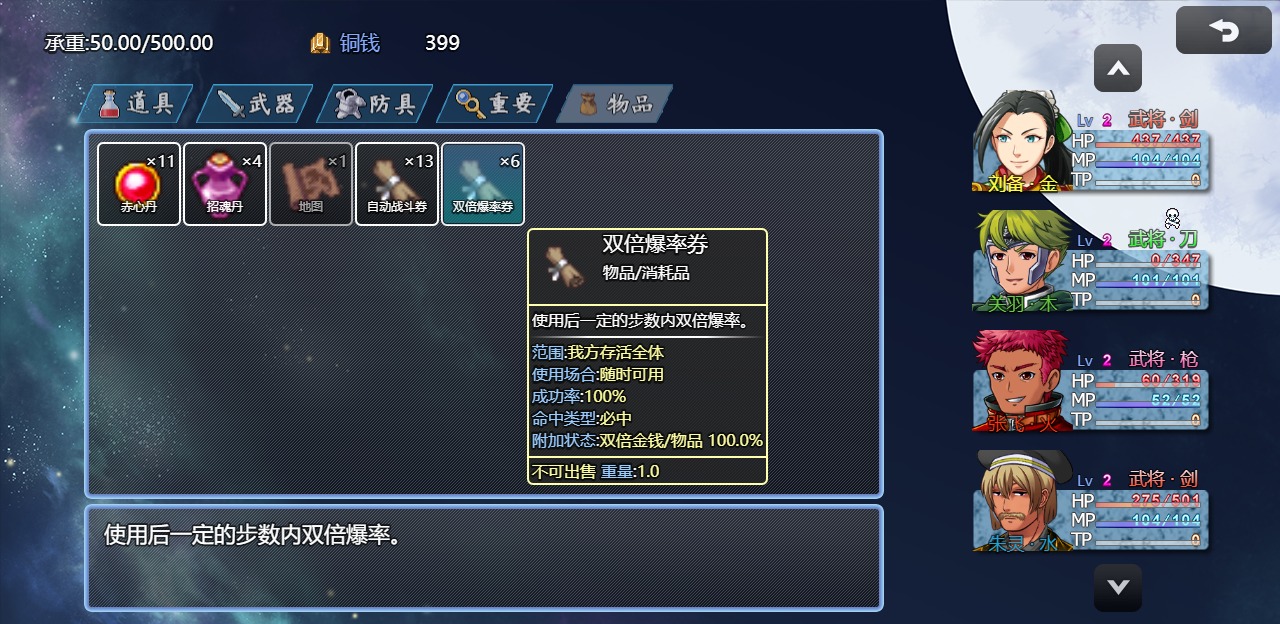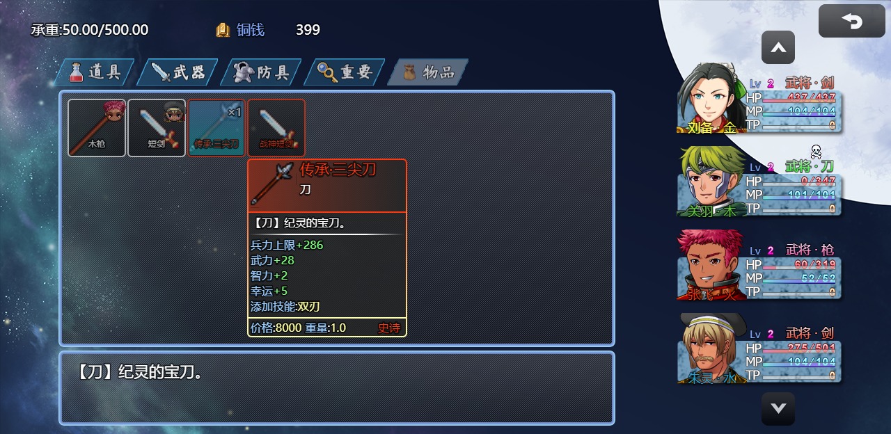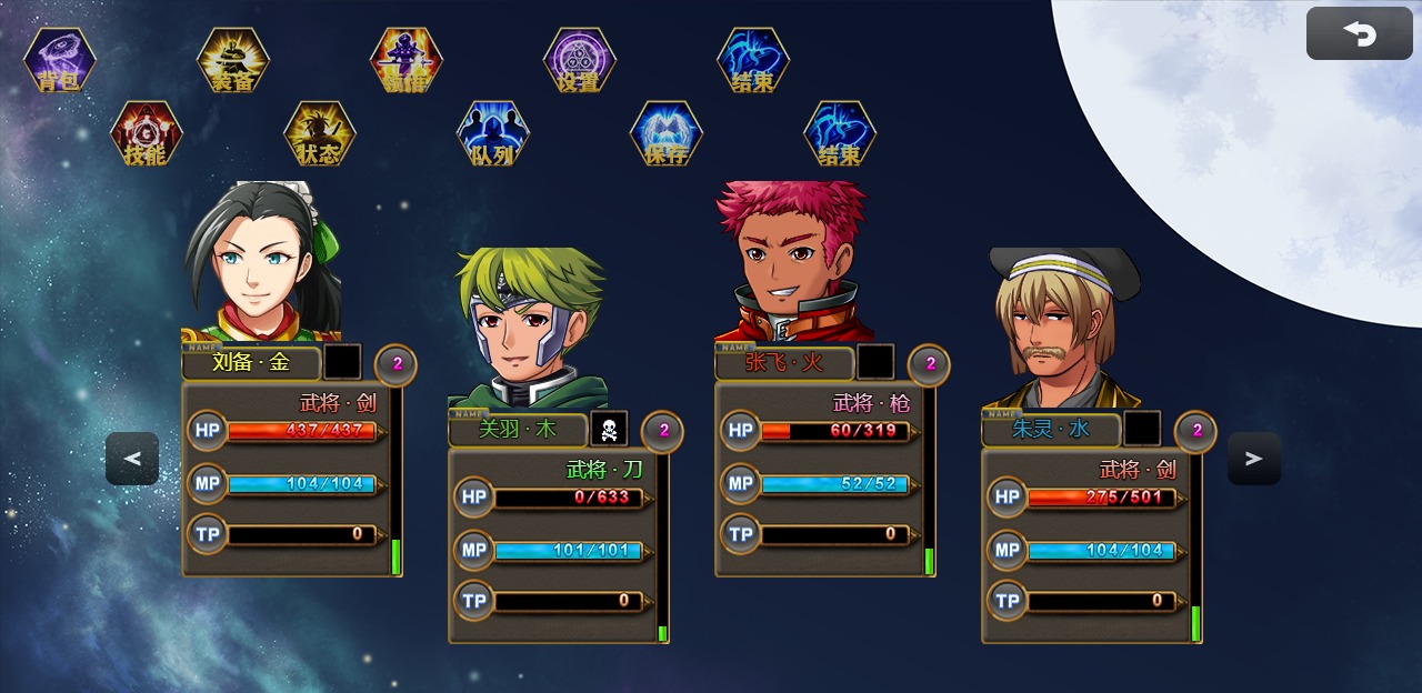 游戏深度还原了三国的历史背景,每位英雄都拥有独特的元素属性:刘备代表金,关羽象征木,后续加入的武将也都有各自的元素特性。游戏还引入了复杂的武器相克系统,比如"刀克剑,刀克弓,斧克刀"等,这些机制需要玩家花时间熟悉和记忆。战斗系统强调策略性,合理搭配队伍成员和武器类型是取胜的关键。虽然游戏难度较高,但正是这种硬核设定让每场胜利都充满成就感。
