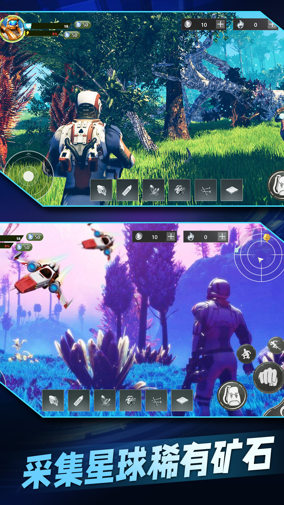 当你初步适应了周围环境后,游戏还提供了深度的探索玩法。通过解锁先进技术,你可以前往更危险的区域进行探险。游戏中的行星直径长达120公里,包含多种不同的生物群落。从南极到北极,每个区域都有独特的环境特征和资源分布,等待你去发现和征服。