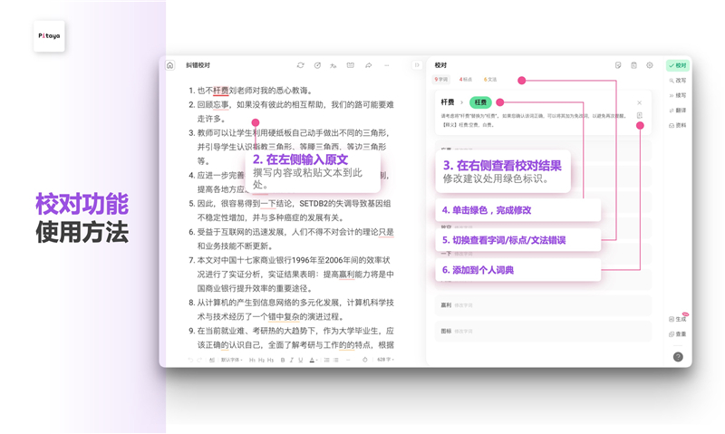 火龙果的校对系统采用最先进的AI技术,能够识别100多种常见错误类型。免费用户每天可校对500字,适合偶尔需要检查短文的用户。标准版会员每天可校对4万字,适合日常写作需求。专业版会员则享有无限次数的校对服务,特别适合需要频繁检查大量文档的专业人士。