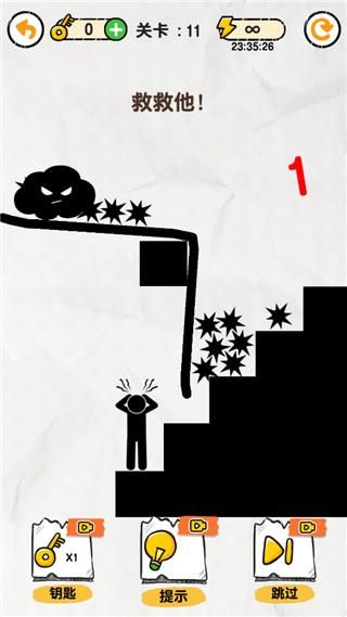 这款游戏最大的亮点在于其富有创意的关卡设计,每个挑战场景都经过精心构思。在关卡中,上方会显示当前关卡进度和资源数值,而火柴人往往处于各种危险境地,比如头顶有炸弹等威胁。玩家需要通过画线操作来改变场景中物体的位置和状态,目标是避免火柴人受到伤害,这种简单明了的规则让玩家能够快速上手。每个场景的设定都非常明确,危险物品和火柴人的位置都是固定的,但玩家的画线操作将直接决定救援的成败。游戏还通过资源管理和关卡进度系统来辅助游戏体验,既考验玩家的策略思维能力,又需要灵活的操作技巧,这种独特的玩法组合让游戏充满了挑战性和趣味性。