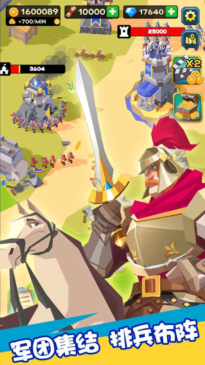 在游戏中你需要表现得像一位国王,指导自己的军团如何征服基地、箭塔与城堡。针对不同得情况搭配不同天赋得将领,获得收益后不断得强化自己得军团,培养自己得将领。王国科技树系统允许玩家优先发展骑兵冲锋或箭塔射程等专项能力,每个选择都会显著改变后期战斗方式。