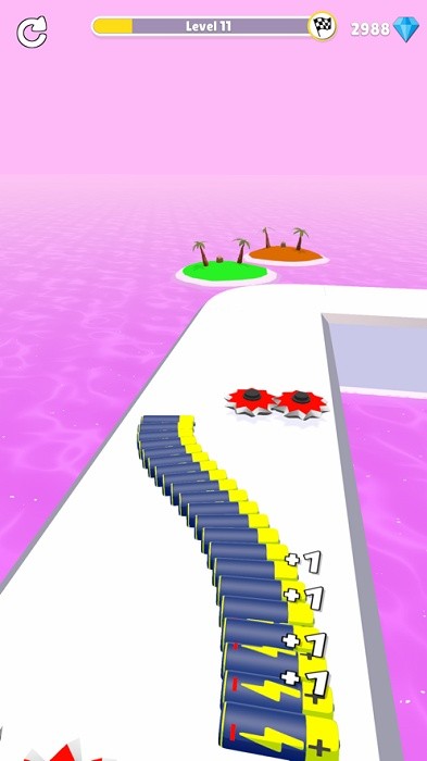 游戏最大的特色就是将收集电池的过程变成了类似人体蜈蚣的独特操作体验。跑酷的主角就是那些串联在一起的电池,它们会随着收集不断延长,形成一条充满活力的"电池蜈蚣"。游戏强化了收集电池后的美术效果,每次收集都会带来炫目的视觉反馈。关卡设计充满创意,既有需要快速反应的障碍躲避,也有需要策略思考的路线选择。特别值得一提的是,每添加一节电池都会出现动态的+1提示,这些提示会随着电池的前进而逐渐缩小虚化,为游戏增添了不少视觉趣味。