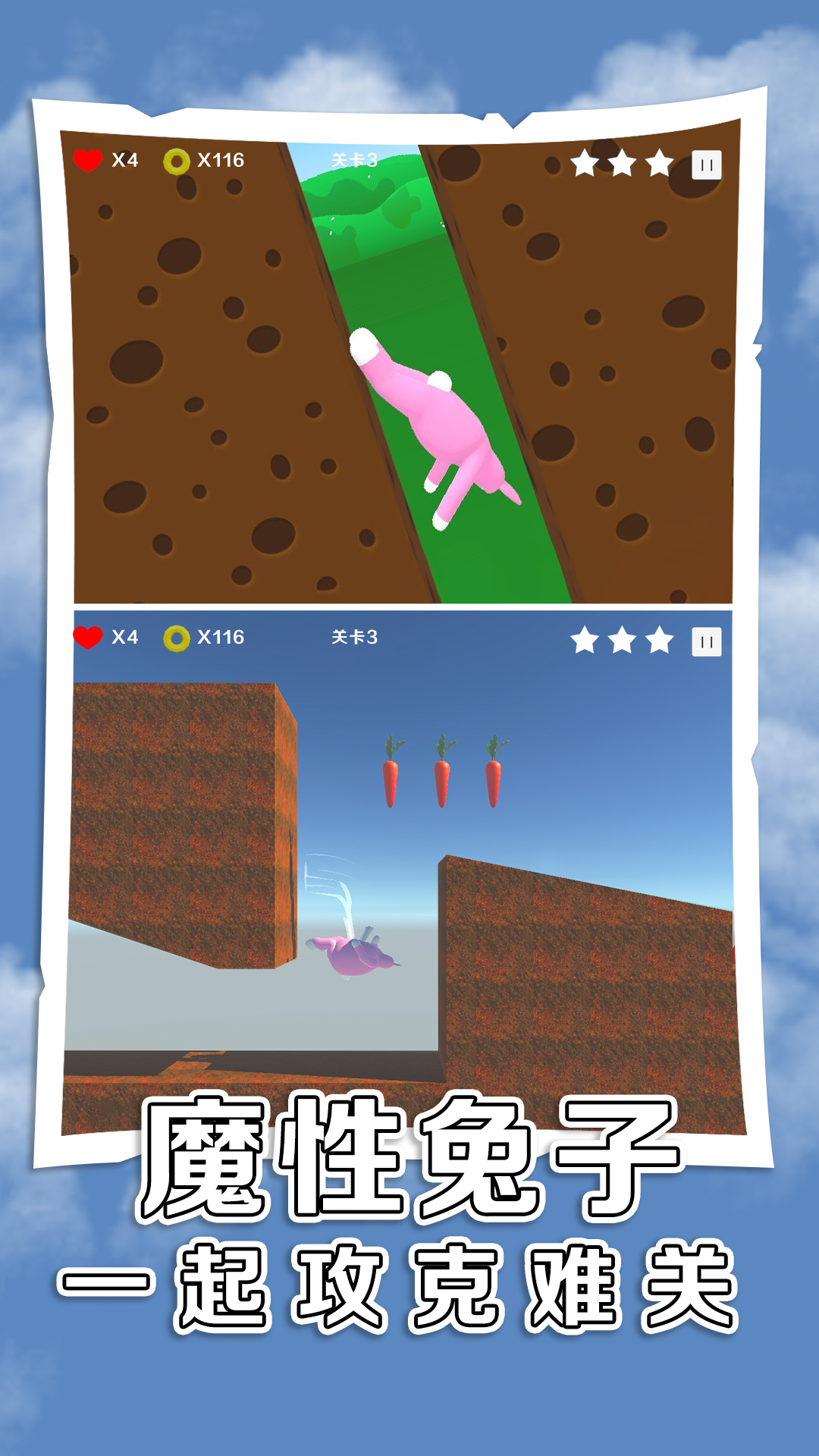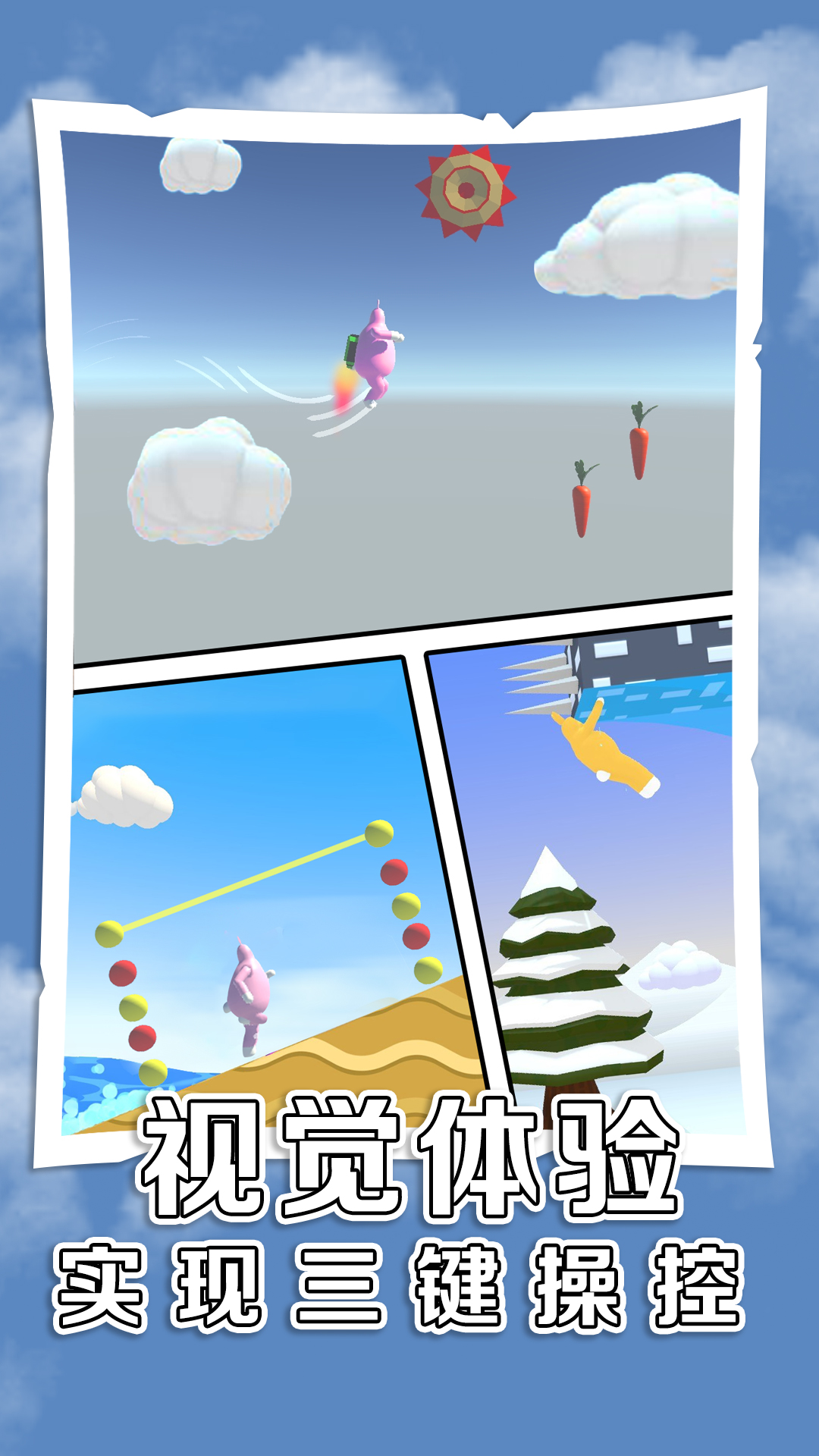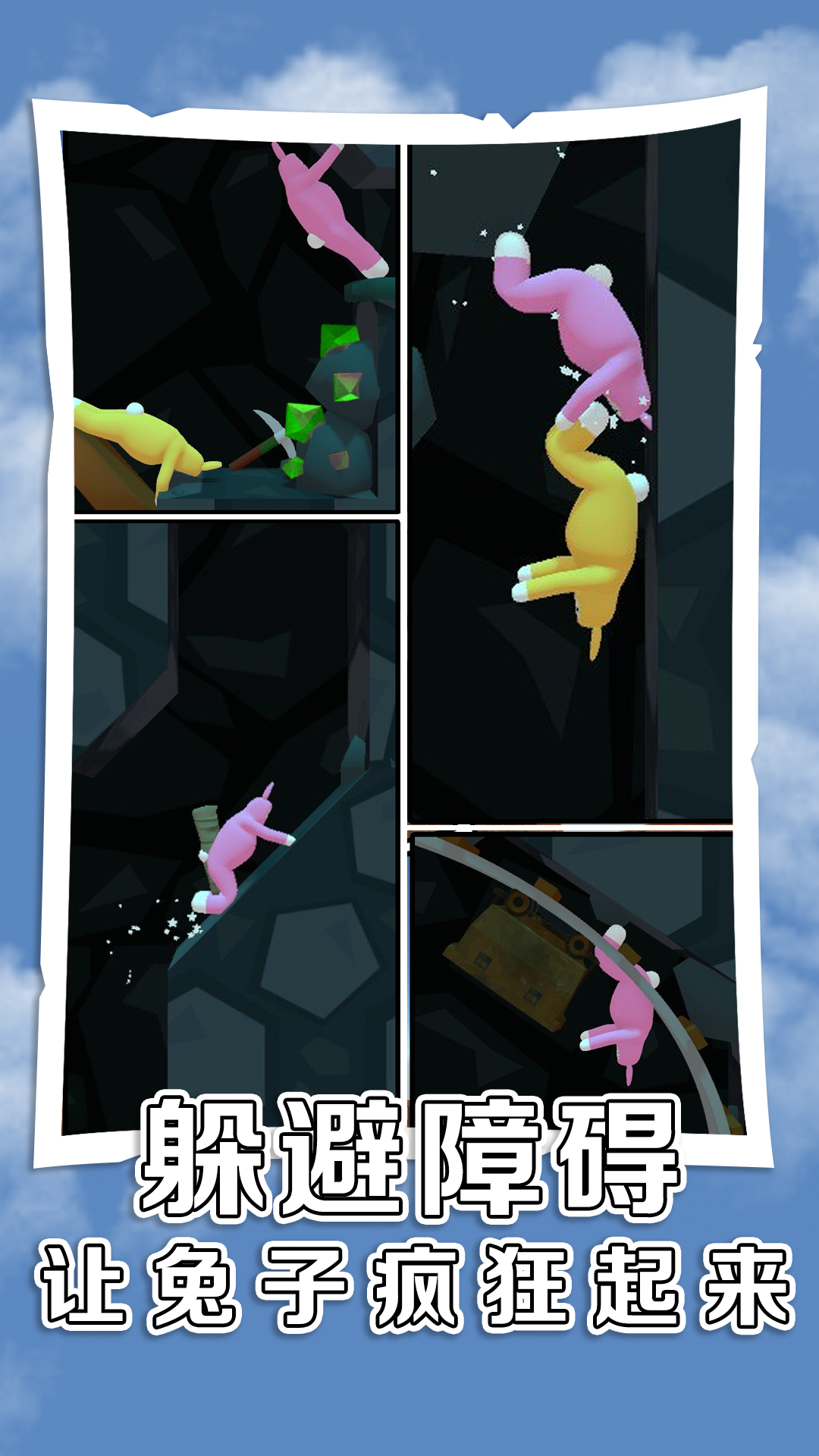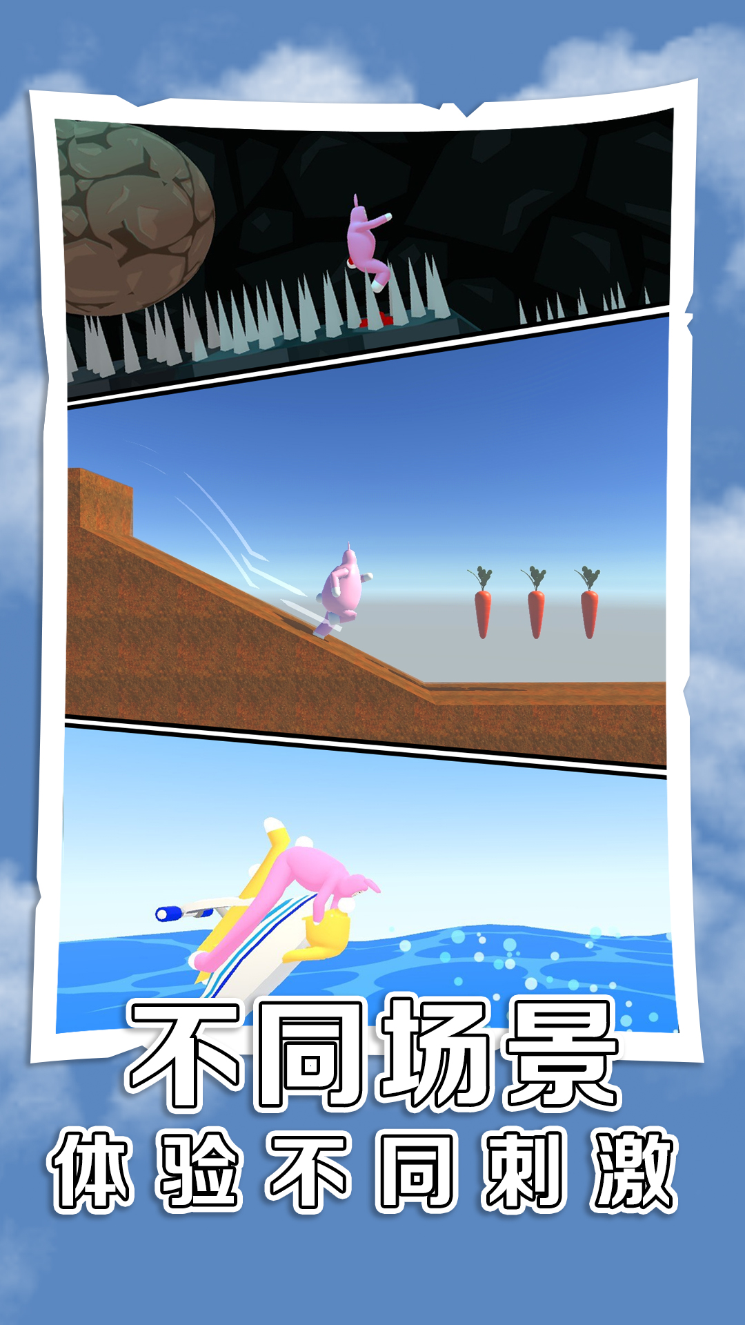 虐心兔子人是一款基于物理引擎的翻滚类游戏,玩法简单易上手但极具挑战性。在游戏中,玩家需要通过触屏操作来控制兔子人完成各种动作,包括翻滚、跳跃、爬行等,目标是让兔子人安全到达旋转的传送门。沿途你会遇到各种恶搞的机关陷阱,比如悬崖、地刺等障碍物。游戏还特别设计了收集系统,拾取萝卜可以增加喷射次数,帮助玩家更好地完成关卡。这款游戏不仅考验玩家的操作技巧,还需要你发挥聪明才智来应对各种突发情况。