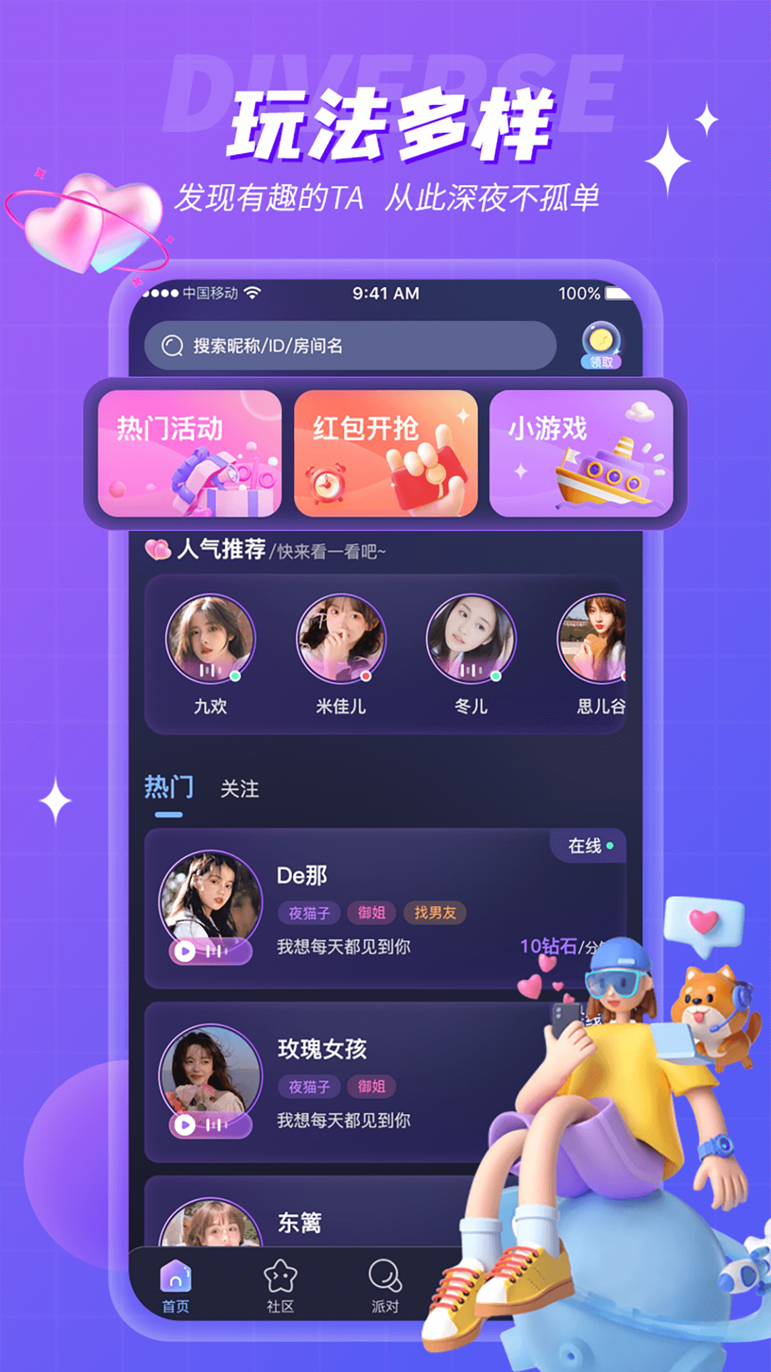 超多玩法:平台提供丰富多样的互动方式,包括语音PK、暖心电台、在线K歌等特色功能,让你在娱乐中结识朋友。独特的爱情探索模式,帮助你找到志趣相投的伙伴。