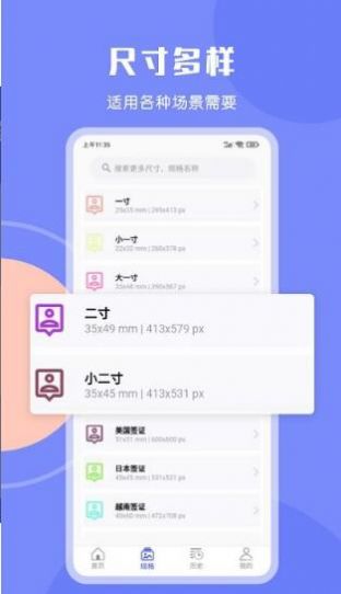 【尺寸齐全】常规热门尺寸方便选择,一寸证件照、两寸证件照等上百种证件照类型,还支持自定义尺寸输入,满足特殊场景需求,如考试报名或简历照片。