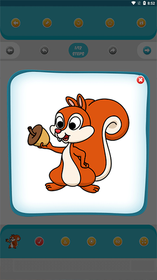 artset4的操作界面直观易用:油漆桶工具(黄色图标)可以快速填充大面积颜色;左右箭头分别用于撤销和重做操作;旋转箭头能重置画布;橡皮擦工具可以修正错误;星星图标用于收藏喜欢的模板;眼镜图标可以隐藏临摹线;紫色圆圈可以调节画笔粗细;完成作品后,点击右上角的文件图标即可保存。保存的作品可以在主页查看,收藏的模板则通过星星按钮访问。
