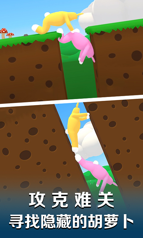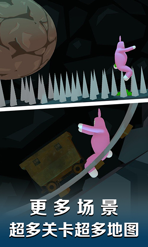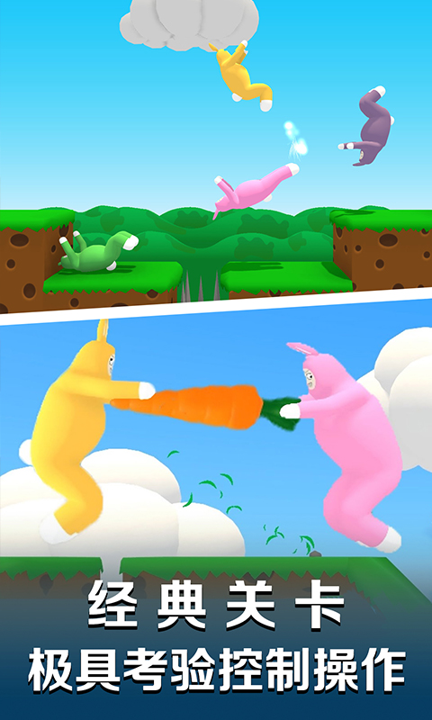 这是一款极具魔性的物理翻滚游戏,玩家需要通过触屏精准控制兔子人完成各种高难度动作。游戏中,兔子人会像布娃娃一样做出各种夸张的翻滚动作,玩家要巧妙利用这些物理特性来通过旋转的传送门和危险的机关。特别值得一提的是,游戏中的陷阱设计充满恶搞元素,比如突然弹出的地刺、摇摆的大锤等,让闯关过程充满意外惊喜。收集胡萝卜不仅能解锁新关卡,还能增强兔子人的喷射能力,让冒险更加轻松有趣。