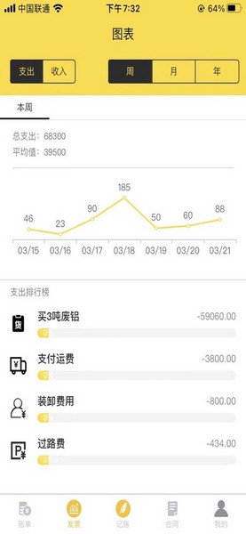 智能统计:折线图、饼图清晰显示周、月收支构成,支持导出报表功能,方便进行更深入的数据分析。