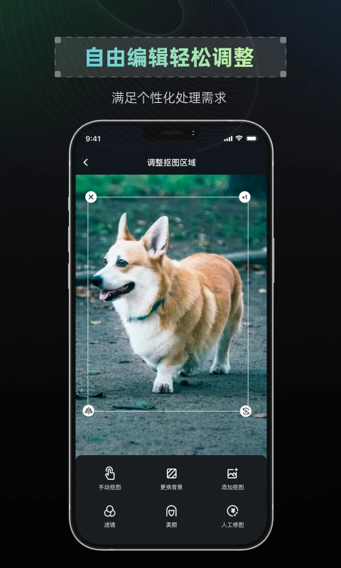 支持抠图区域手动调整,描边、调整尺寸、更改滤镜风格,进行人像美颜,添加更换背景等个性化处理