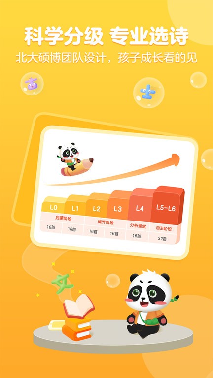 由北大硕博团队合力打造的完整课程体系,包含L1-L6六个级别。课程以古诗为主线,拓展识字、表达、阅读、文学常识等内容,全方位提升孩子的文学素养和语言能力。