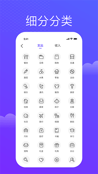 全面分类体系:内置超过50个精细消费分类,涵盖餐饮、交通、娱乐、医疗等各个方面,每个分类还支持自定义子标签,满足不同用户的个性化记账需求。