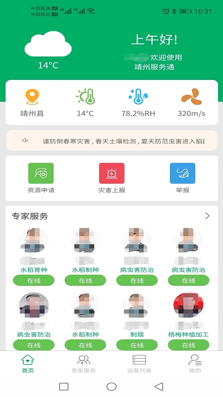 专家团队为用户提供24小时在线的远程诊断和技术指导服务,支持视频连线、图文咨询等多种沟通方式;实时监测并展示各类农业设备的运行数据和工作状态,帮助用户掌握田间作业情况;整合了区域内农机服务资源,支持在线申请农机作业、粮食烘干、仓储管理等服务,同时提供自然灾害预警和病虫害防治信息上报通道,构建全方位的农业生产保障体系。