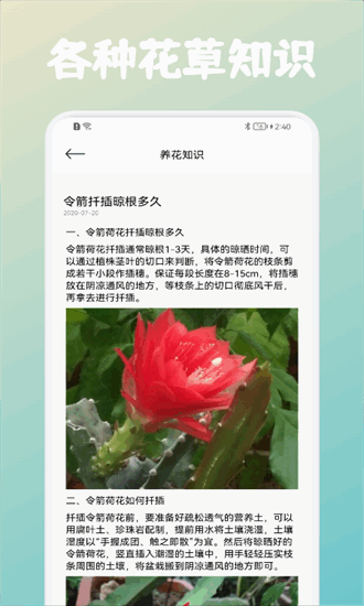 花草植物识别是一款基于人工智能技术的专业植物识别工具,能够通过拍照或相册图片快速准确地识别各类植物。它不仅提供基础的植物名称信息,还包含详细的生长环境、花期特征等专业内容,是植物爱好者的知识宝库。应用特别设计了社区分享功能,让用户可以交流养护经验。无论是初学者还是资深园艺师,都能在这里找到实用的植物知识,开启探索植物世界的奇妙之旅。