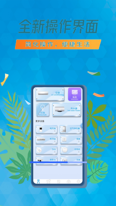 智能家电遥控:作为核心功能,软件支持对空调、电视、风扇、热水器、灯泡、空气净化器、机顶盒、投影仪、扫地机器人等十几种家电的遥控操作。适配成功后,用户可以通过手机一键控制家中所有电器,享受真正的智能家居生活。