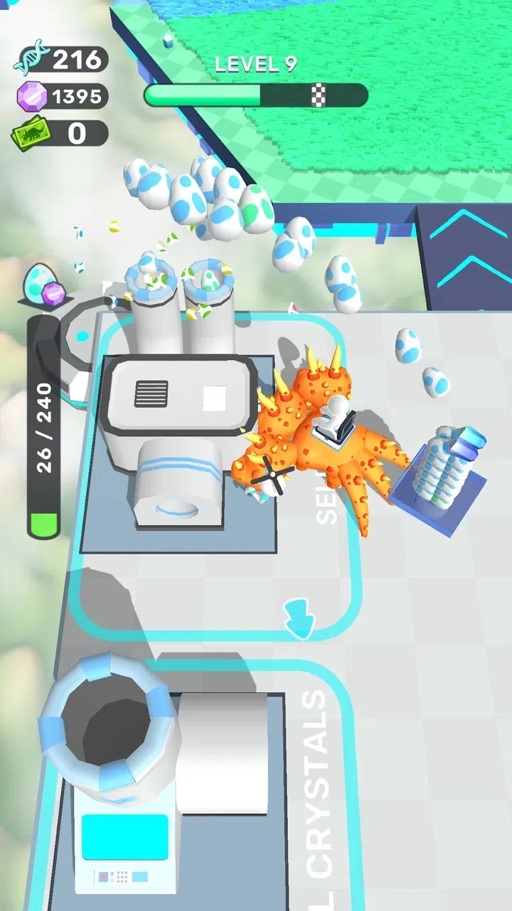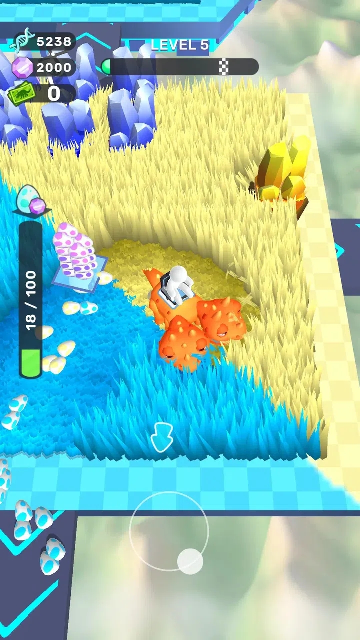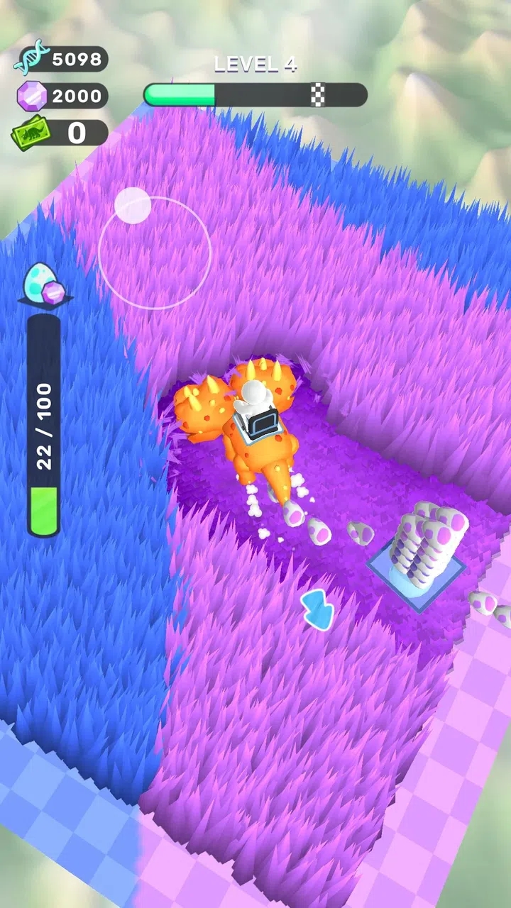 游戏的核心玩法简单有趣:首先通过割草收集鸡蛋,然后将这些鸡蛋转化为珍贵的DNA。利用DNA可以升级你的恐龙,改善它的身体部位,让它变得更加强大。随着游戏进程推进,你将解锁新的区域,在那里可以收集到更多稀有鸡蛋,加速你的成长进度,同时还能扩展你的基地。