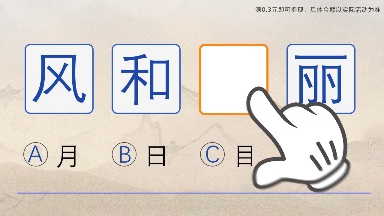 一起涨知时作为一款高品质休闲手游,不仅拥有极高的可玩性,还融入了丰厚的奖励机制。玩家在成功闯关后即可获得现金红包奖励,每个关卡都经过巧妙设计,带来独特的挑战体验。游戏收录了海量成语知识库,配合精美的游戏画面和直观的操作界面,玩家只需点击相应按钮,根据图片提示猜出正确成语即可通关。这种寓教于乐的玩法设计,让学习成语变得轻松有趣,赶快下载体验吧!