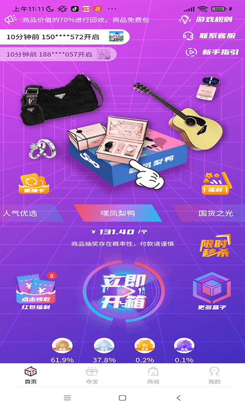 潮物app是一款专为潮流爱好者打造的线上盲盒购物平台,它以独特的盲盒玩法为核心,为用户带来充满惊喜的购物体验。在这里,你可以发现来自全球各地的潮流好物,从限量版手办到设计师联名款,每一款商品都以盲盒形式呈现,让拆盒的瞬间充满期待与乐趣。平台每天都会更新海量商品资源,涵盖不同风格和价位,无论你是资深收藏家还是潮流新手,都能找到心仪之选。