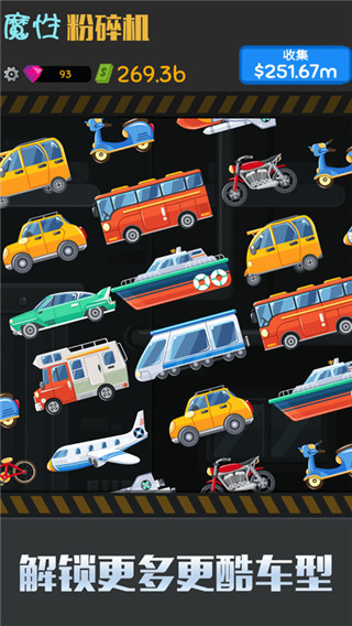 点击车辆即可自动拆分零件,系统会智能识别最佳粉碎位置,确保粉碎效果最大化。粉碎后的材料会被自动回收转化为金币,这些金币可以用来升级粉碎机性能或解锁更多粉碎场景。玩家可以自由调整粉碎机的压力大小和下落高度,创造出不同的粉碎效果,体验不同的破坏快感。即使离线期间,粉碎机也会持续工作产生收益,下次登录时即可领取丰厚奖励,完全不用担心进度落后。