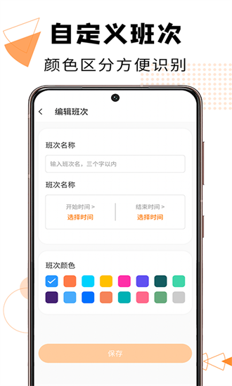 班别颜色自定义功能,可以根据个人喜好设置不同颜色,通过醒目的色彩分类,快速识别每日排班信息。颜色方案支持保存,下次使用自动加载。