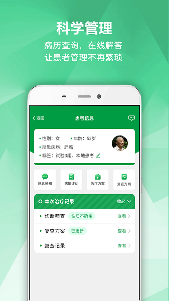 平台采用智能分诊机制,帮助医生高效管理患者群体。通过自定义标签功能,医生可对患者进行精细化分类,如按疾病类型、治疗阶段等维度建立专属患者库。完善的电子病历系统支持CT、MRI等医学影像的云端调阅,病例资料永久保存且支持多端同步。独特的科研数据看板功能,可自动统计患者群体的治疗效果、并发症发生率等关键指标,为学术研究提供数据支撑。随访提醒模块确保重要复诊节点不被遗漏,提升医疗服务质量。