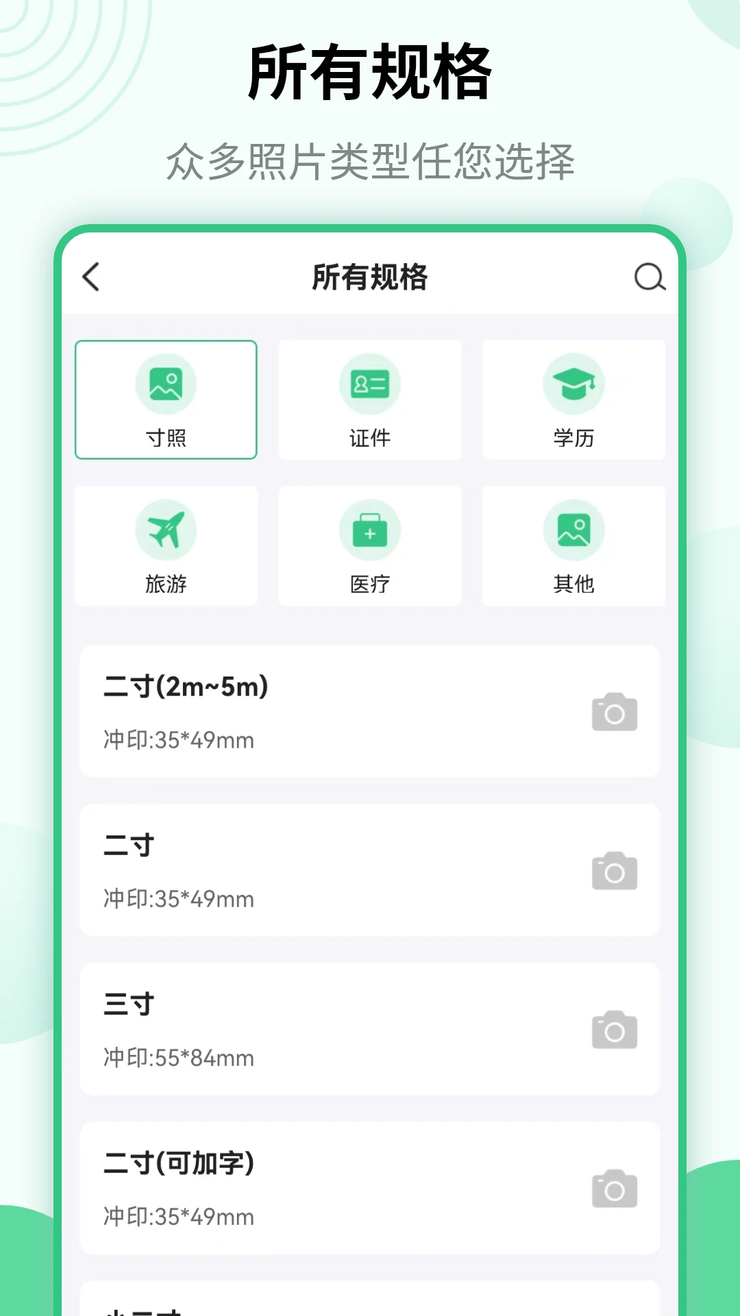 应用内含盖1寸、2寸、3寸、4寸等常用尺寸,如:毕业照、学位照等学生证照;考研、考公、幼师及技能类考试证照;还有社保、护照、驾照、签证、结婚证件照等其他您需要的各类拍摄场景需求。软件内包含当下热门的证件照尺寸,更便捷高效的用手机就能制作出需要的证件照!