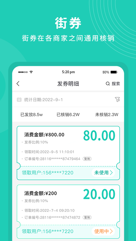 【数据分析】随时随地查看门店经营数据,送券收券数据,用户消费行为数据,并支持自定义报表导出,便于深度分析。【店铺管理】管理店铺介绍、产品及服务、营业时间、营业状态,也可以管理所有连锁门店信息,实现跨区域统一运营。【街券配置】根据推广策略,及时调整消费送券比例,同时支持动态定价和个性化优惠券发放,提升用户粘性。