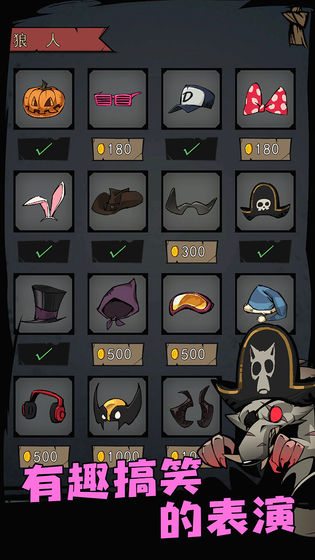 游戏中的幽默元素无处不在,比如当玩家防御失败时,会出现"三个夜晚都撑不过下来,还想要奖励"的调侃,同时奖励图标会滑稽地飞走。装扮系统也是一大亮点,玩家可以为狼人角色换上各种搞笑装扮,比如南瓜头套,虽然这并不能真正隐藏狼人的身份。