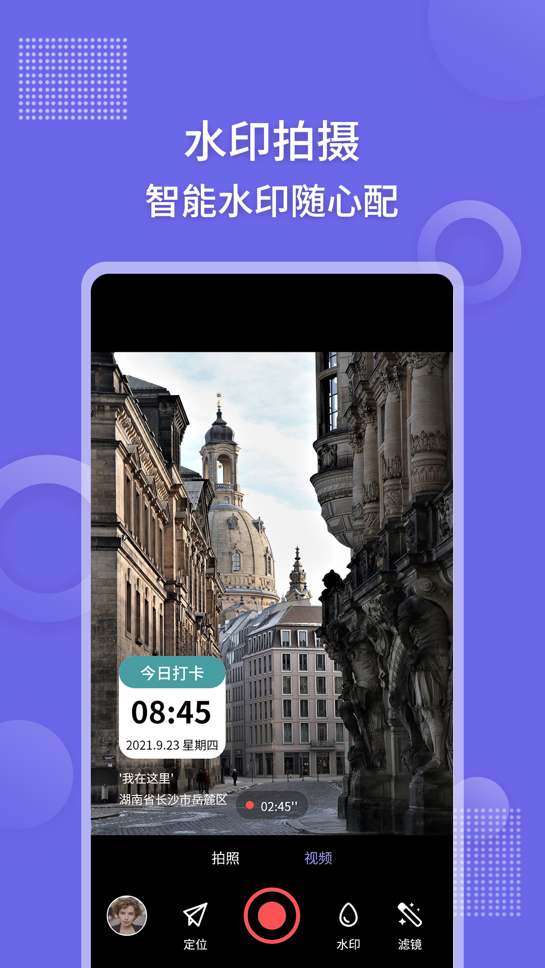丰富滤镜效果:提供多种专业级滤镜调节选项,让您的水印打卡照片更具艺术感,一拍即可生成带有精美滤镜的水印照片,轻松提升照片质感。