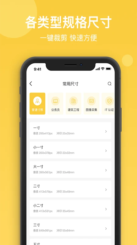 不仅包含一寸、两寸、三寸、四寸、小一寸、小二寸等常规证件照尺寸,还人性化地为用户提供场景选择。如:身份证、驾驶证、社保证、签证等证件;计算机、教资、会计、考研、公务员、英语四六级、普通话等百余种考试等。