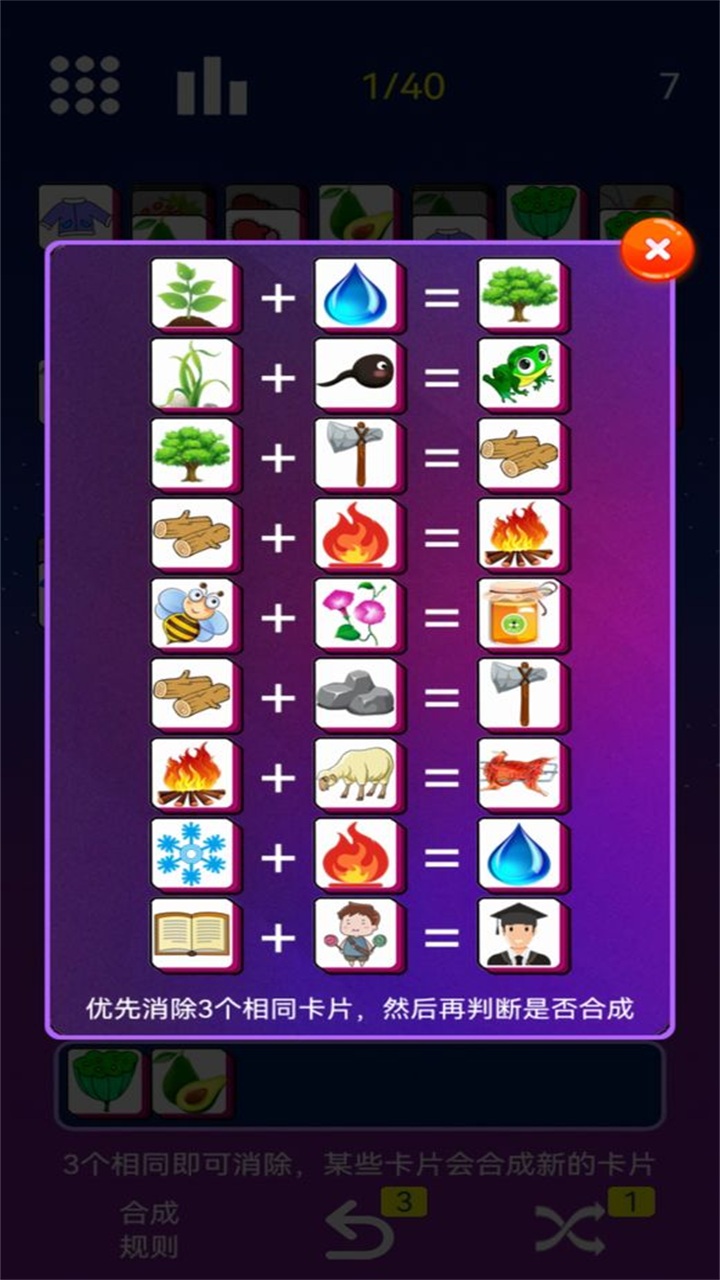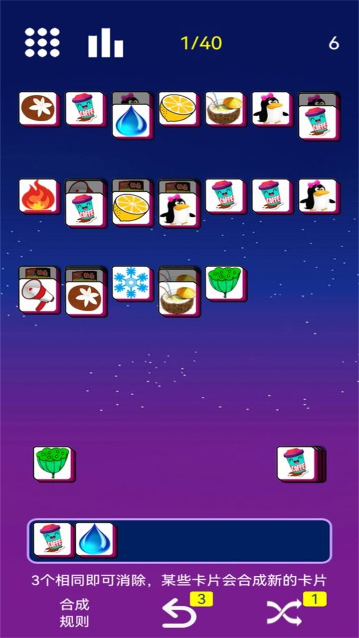 《星空消消消》采用了创新的多层消除机制,每关游戏都由三层及以上的方块构成。玩家需要从最上层开始点击方块,将它们收集到下方的收集框中。当三个相同图案的方块相遇时就会自动消除,不同图案的方块则会保留在收集框中等待后续匹配。游戏还贴心地设计了自动排列功能,当收集到两个相同图案时,它们会自动相邻排列,这样玩家就能更直观地看到还差哪个图案就能完成消除。此外,由于方块是层层叠加的,玩家可以通过露出的边角来判断下方方块的图案,这种设计既增加了游戏的策略性,又让消除过程更加有趣。