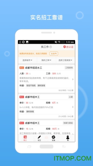 建筑招工软件app是一款专注于建筑行业人才招聘的移动应用平台,致力于为建筑企业和求职者搭建高效、便捷的沟通桥梁。作为建筑劳务行业的垂直招聘平台,我们通过严格的实名认证体系,确保招聘信息的真实性和可靠性,让建筑行业的人才流动更加顺畅,同时满足企业快速匹配优质人才的需求。平台每日更新大量求职和招聘信息,为建筑行业从业者提供丰富的工作机会,帮助企业解决用工难题。无论您是建筑工人、项目经理还是劳务公司,都能在这里找到最适合的合作伙伴。