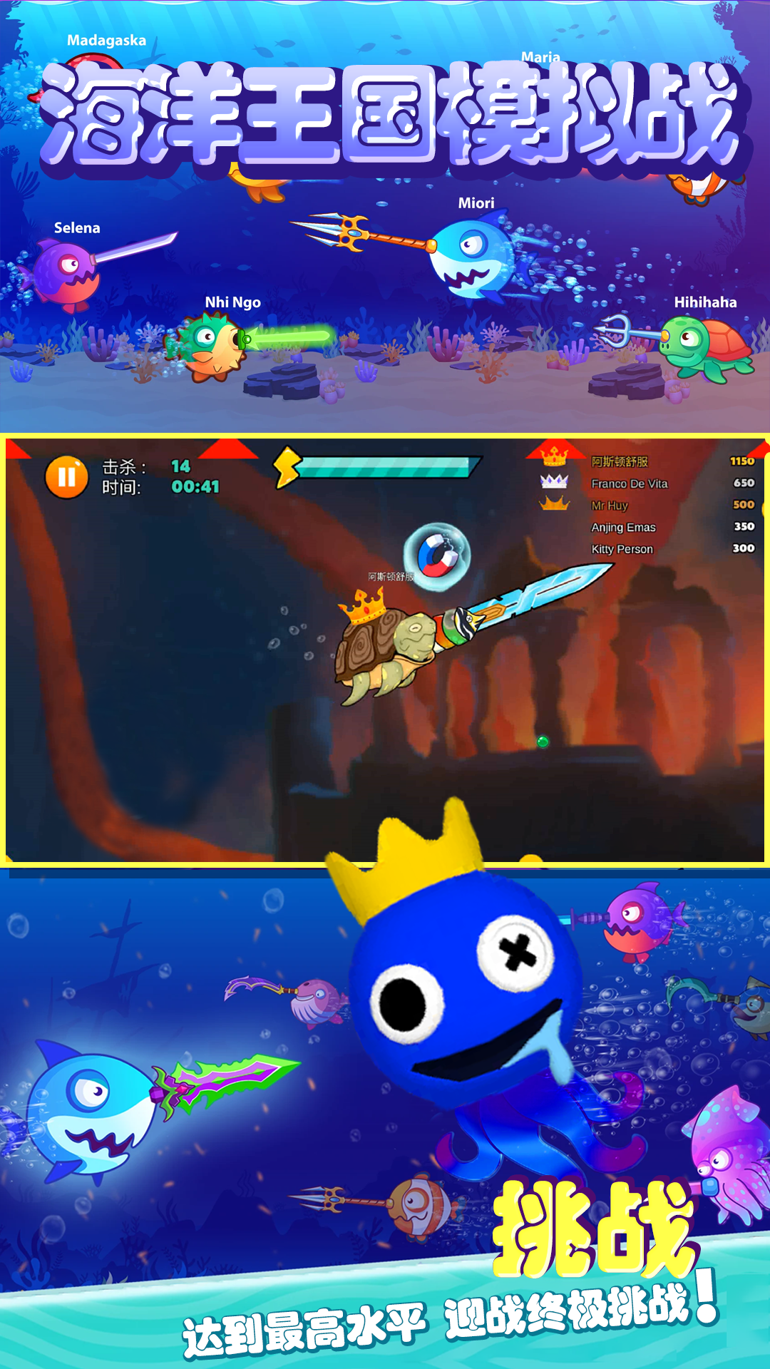 《海洋王国模拟战》是一款充满刺激与挑战的海底io大乱斗游戏。玩家将化身为一条小鱼,在危机四伏的海洋世界中展开冒险。通过不断吞噬其他鱼类来进化成长,解锁更强大的武器和技能。游戏支持全球玩家实时对战,在绚丽的海底场景中展开激烈角逐。从弱小到强大,从猎物到猎手,你需要运用策略和技巧,最终成为称霸海洋的终极霸主。丰富的养成系统和多样化的战斗方式,将带给你前所未有的海底冒险体验。