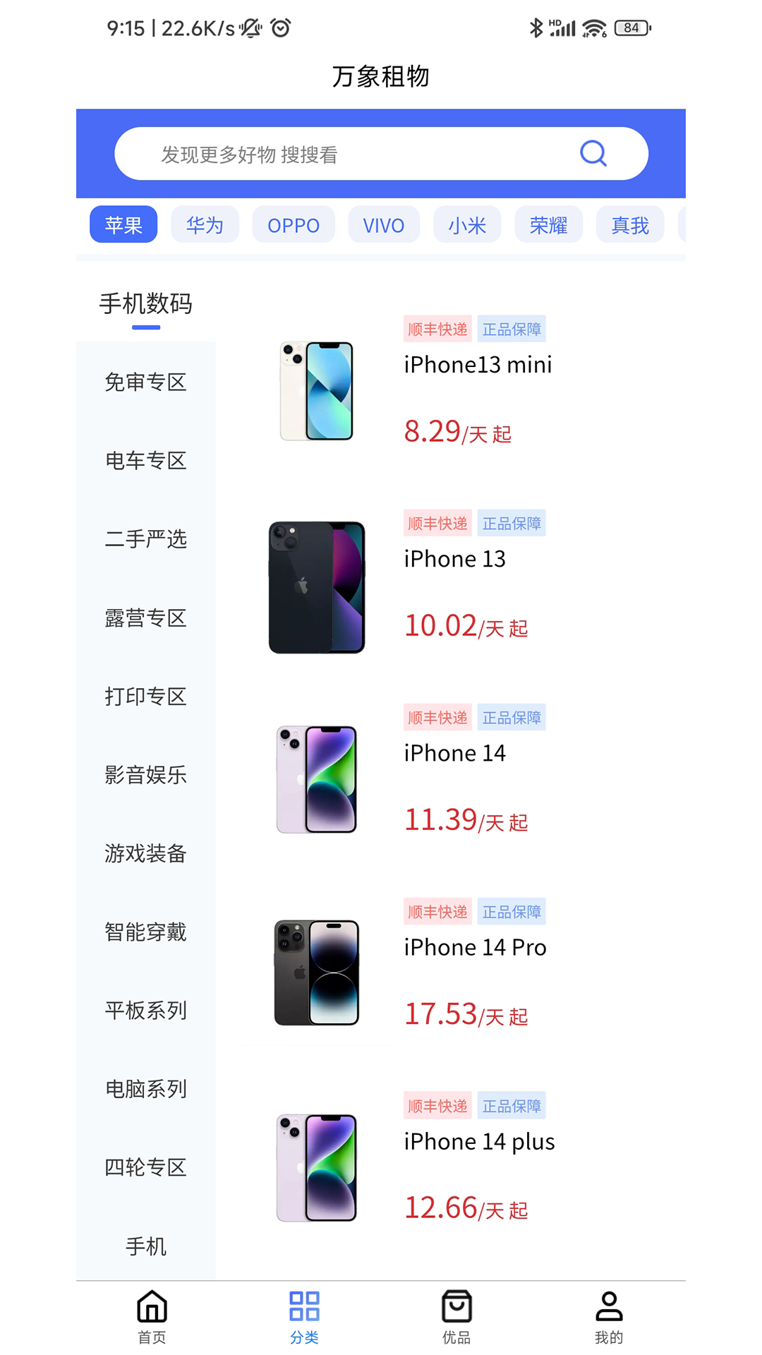 用于3C数码产品的租赁,你可以租赁手机,电脑,耳机,打印机,帐篷等产品,