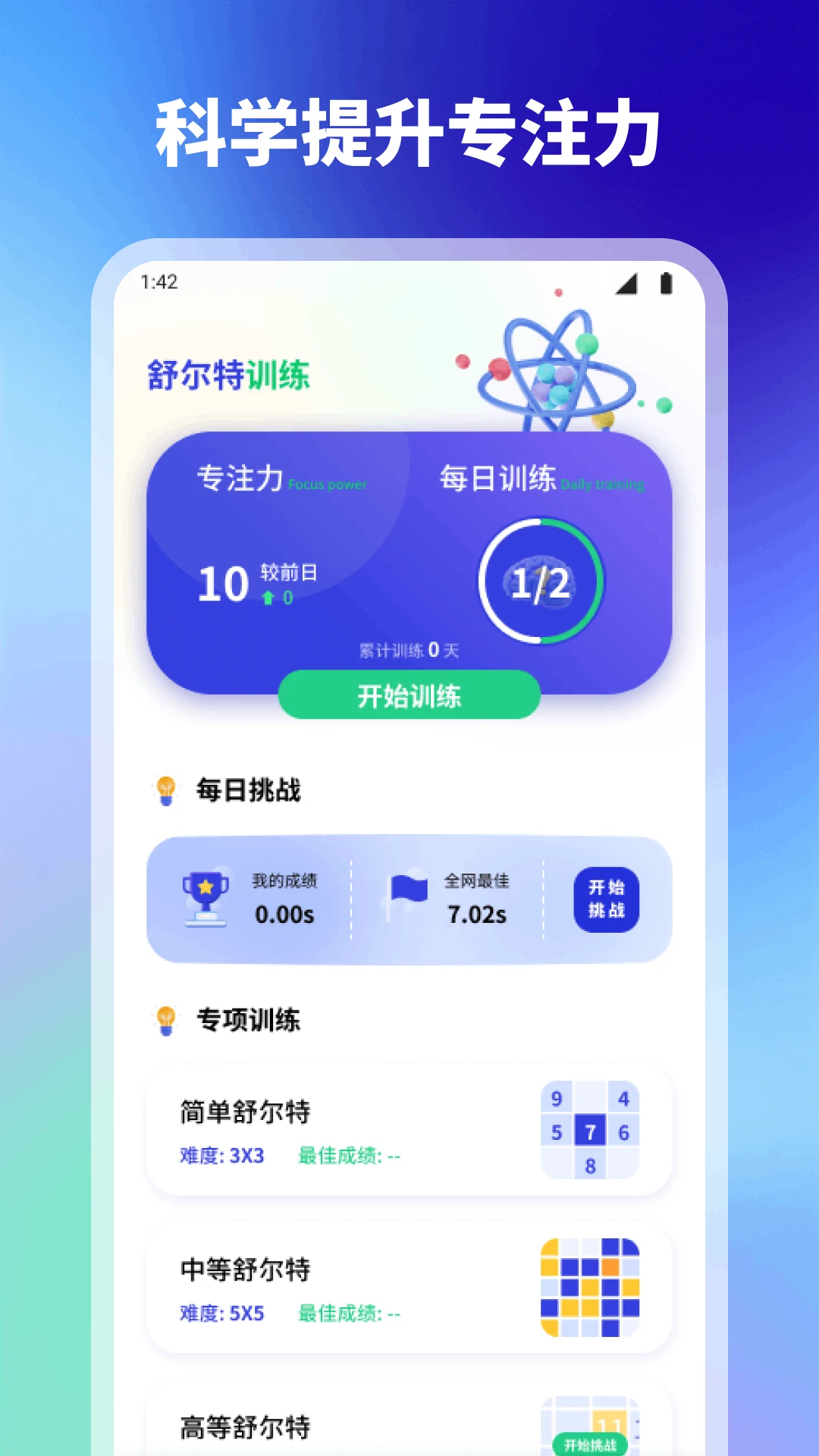 舒尔特方格专注力训练是一款基于经典心理学实验设计的注意力提升工具,通过数字矩阵挑战帮助用户量化并改善专注能力。其核心玩法要求使用者在规定时间内按顺序点击随机分布的数字方格,系统将根据完成速度动态评估注意力水平。这款训练工具融合了神经科学理论与游戏化设计,被广泛应用于学生专注力培养、职场人士效率提升及特殊儿童教育干预领域,全球超过千万用户验证了其科学性和普适性。