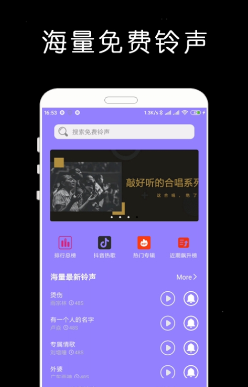 海量铃声资源:提供数万首精选铃声,涵盖多种音乐风格和音效类型,每周持续更新,确保用户总能找到最新最热门的铃声。