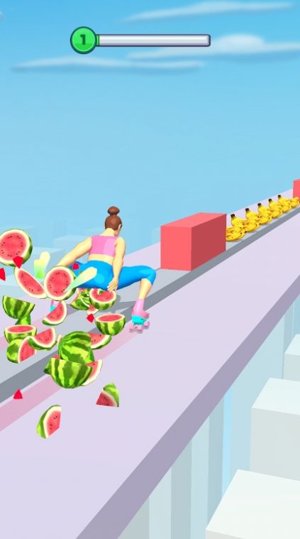 躲避各种障碍物和陷阱,可以让我们顺利到达终点。障碍物设计巧妙,需要玩家灵活应对,考验反应能力。在这里我们可以展示我们的轮滑技巧,并在路上粉碎更多的水果和蔬菜。粉碎特定组合的水果还能触发特殊效果,为跑酷增添策略性。这里我们还可以不断的调整我们的一字马的高度,这样我们就可以压碎更多的水果和蔬菜了。精准控制角色动作是获得高分的关键,玩家需要不断练习掌握技巧。