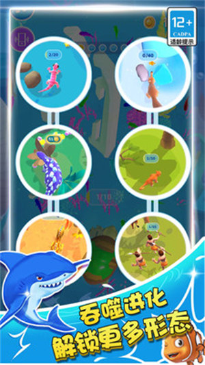 游戏拥有完善的进化系统,玩家可以通过不断吞噬来获得进化点数,逐步成长为海洋领主。游戏收录了上百种海洋生物,每种生物都有独特的造型和属性,玩家可以自由收集和培养。