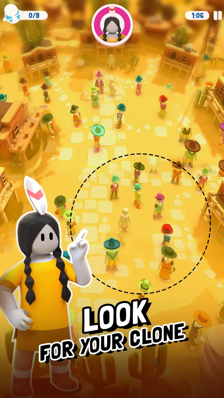 游戏的核心玩法非常有趣:你需要在人群中寻找自己的克隆人!每局游戏开始时,系统会生成多个与你外形相似的克隆体,你的任务就是找到它们并与之融合。游戏设置了多个关卡挑战,每个关卡都会有不同的场景和难度设置。你需要仔细观察每个角色的特征,准确识别出你的克隆体。成功找到并与之合体后,你将获得特殊能力提升。记住,时间就是生命,在限定时间内完成目标才能获得胜利!
