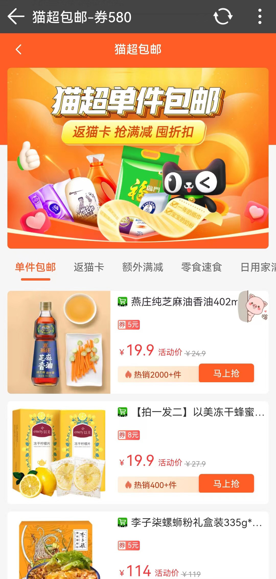 【猫超包邮专区】精选天猫超市单件包邮商品,免去凑单烦恼,一件也能享受包邮服务。