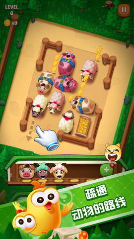 这个有趣的农场的主要目标是解锁并释放农场周围的所有动物,每解救一只小动物都会获得相应的分数奖励。路上会有不同的障碍物:灌木、水桶、栅栏。你应该选择正确的策略来应对它,观察地形并规划最佳移动路线是通关的关键。一只动物可以前后移动,将同一只动物配对,当三只相同动物连成一线时就能成功消除,为后续操作腾出更多空间。
