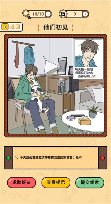 在游戏中,玩家需要通过发现不合理的地方,寻找蛛丝马迹来证明男友的出轨事件。游戏设计了多种类型的推理任务,从简单的物品搜寻到复杂的人际关系推理,内容丰富多样。