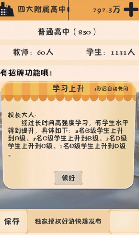 升级设施和教师是长期发展的保障,点击升级按钮,提升设施和教师的能力。