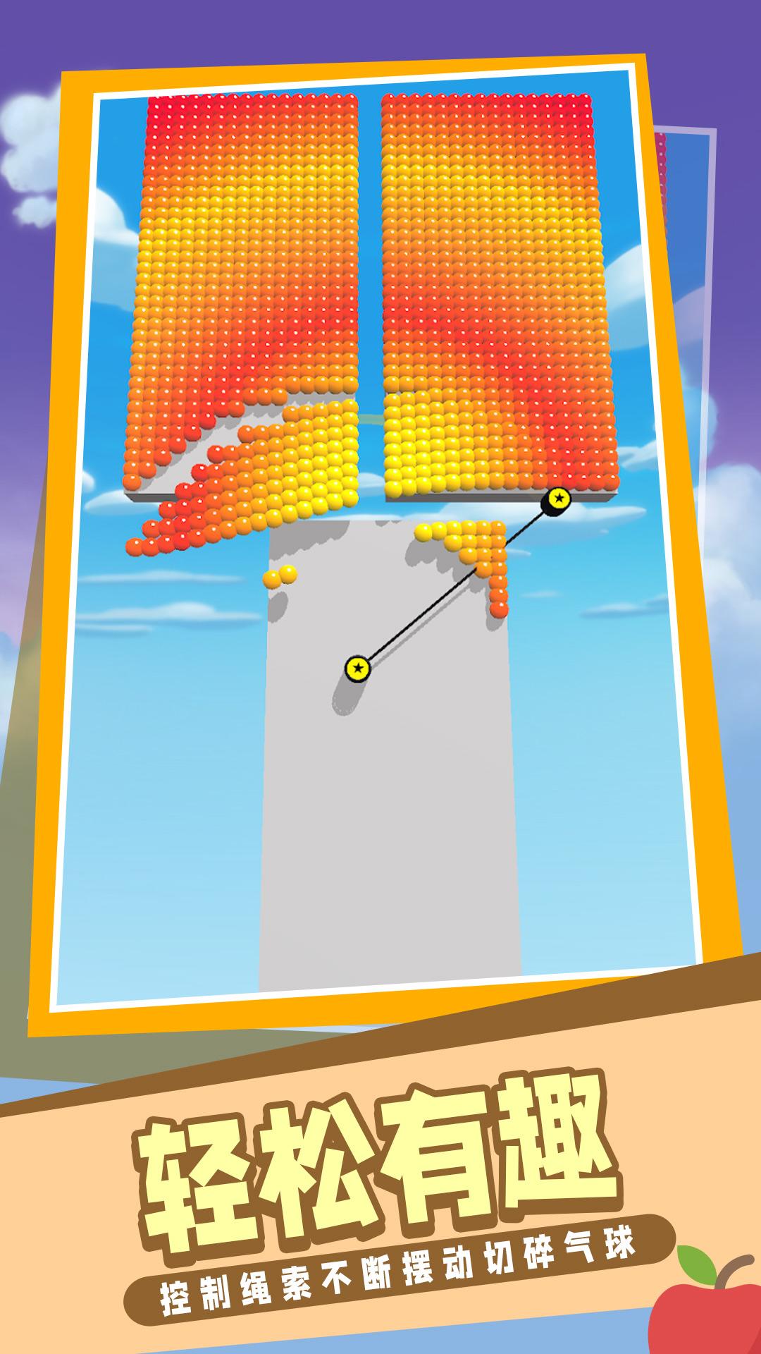 开心小球是一款简单有趣的休闲游戏,玩家通过操控绳子切割小球来获得分数。游戏操作直观易上手,只需轻轻滑动屏幕就能让小球不断落下。随着关卡的推进,挑战难度会逐渐增加,但轻松愉快的游戏氛围能让你完全放松心情。游戏画面色彩鲜艳,物理效果逼真,每次切割都能带来爽快感。无论是想打发碎片时间,还是寻找解压方式,这款游戏都是不错的选择。