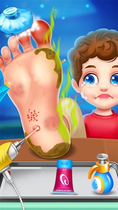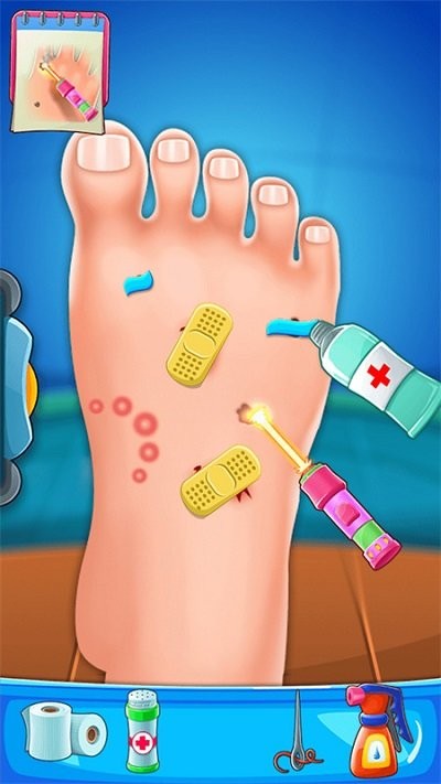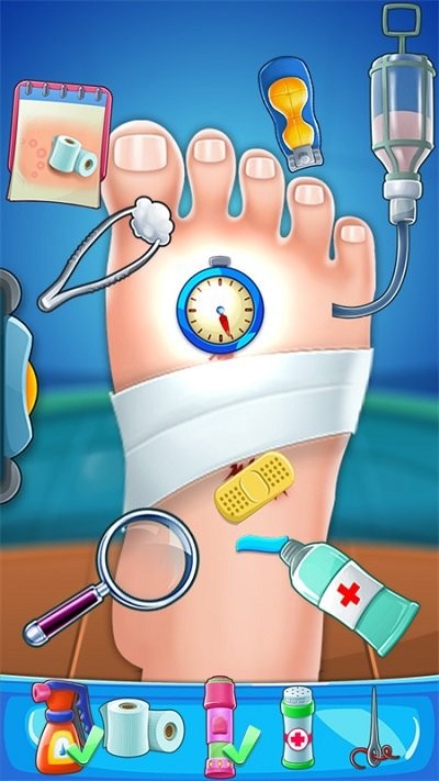 游戏提供了丰富多样的玩法内容,玩家需要处理各种足部疾病和伤口。从基础的伤口消毒到复杂的足部手术,每个关卡都带来不同的挑战。随着游戏进程推进,难度会逐渐提升,玩家需要运用专业的医疗知识和技巧来应对各种突发状况。特别值得一提的是,游戏中还设计了腿部受伤等特殊情况,需要玩家特别注意脚踝和腿部的联动治疗。