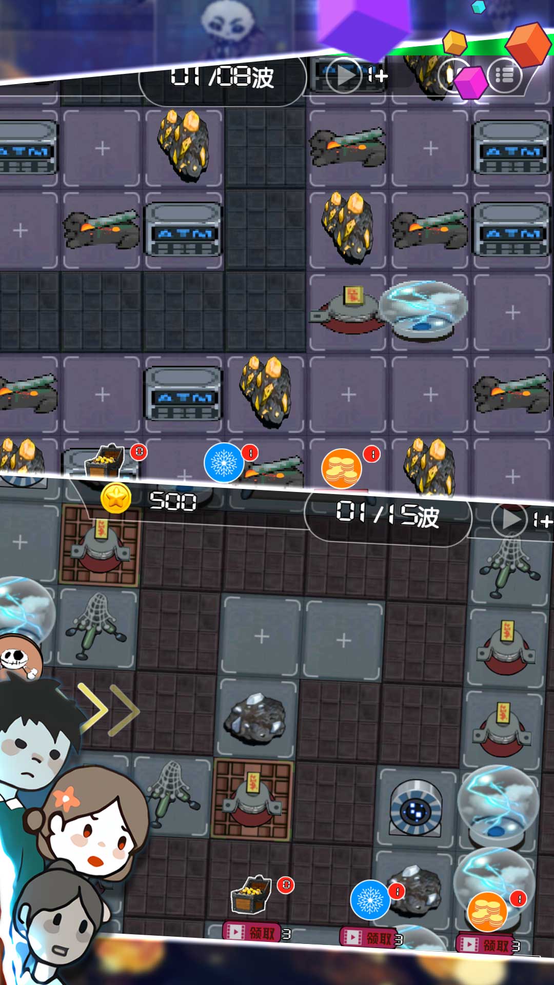 攻击设施是玩家对抗猛鬼的主要手段,其中最基础的是“炮台”。初始炮台为“笤帚炮台”,仅需8金币即可建造,每次升级后,攻击力和电力消耗都会翻倍。随着炮台的升级,它会逐渐进化为“铁铲炮台”甚至“激光炮台”,攻击力大幅提升。有趣的是,这些炮台的形态变化非常夸张,比如从笤帚变成激光炮,让人忍俊不禁的同时也大呼过瘾。