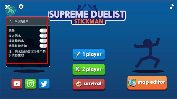 《火柴人至高对决内置菜单》是一款充满挑战性和趣味性的动作格斗游戏,以其独特的玩法和丰富的自定义功能吸引了大量玩家。在游戏中,玩家将操控风格各异的火柴人角色,在精心设计的场景中展开热血沸腾的对决。游戏最大的亮点在于内置菜单功能,它提供了前所未有的自由度,玩家可以随心所欲地调整角色属性、解锁强力技能、选择不同战斗模式,甚至还能自定义游戏难度,让每位玩家都能找到最适合自己的游戏方式。
