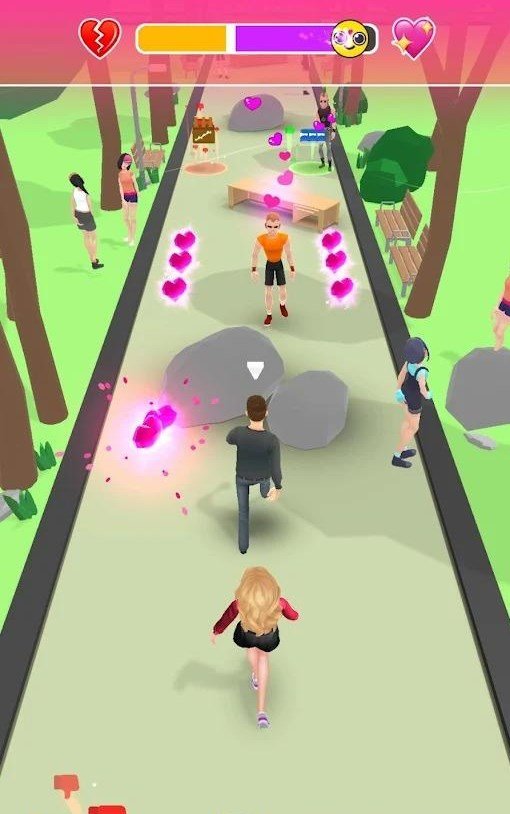 游戏中的场景设计充满温馨浪漫的氛围,每个赛道都点缀着象征爱情的小红心,为玩家营造出甜蜜的视觉体验。在闯关过程中,你会遇到各种追求者,需要巧妙地拒绝他们,同时安抚吃醋的男友。这种独特的互动机制让游戏充满了趣味性和挑战性。此外,你还能在游戏中看到男友吃醋时的可爱模样,为整个冒险增添了不少欢乐。面对障碍时,你需要灵活运用策略,展现自己的智慧,才能顺利通关。