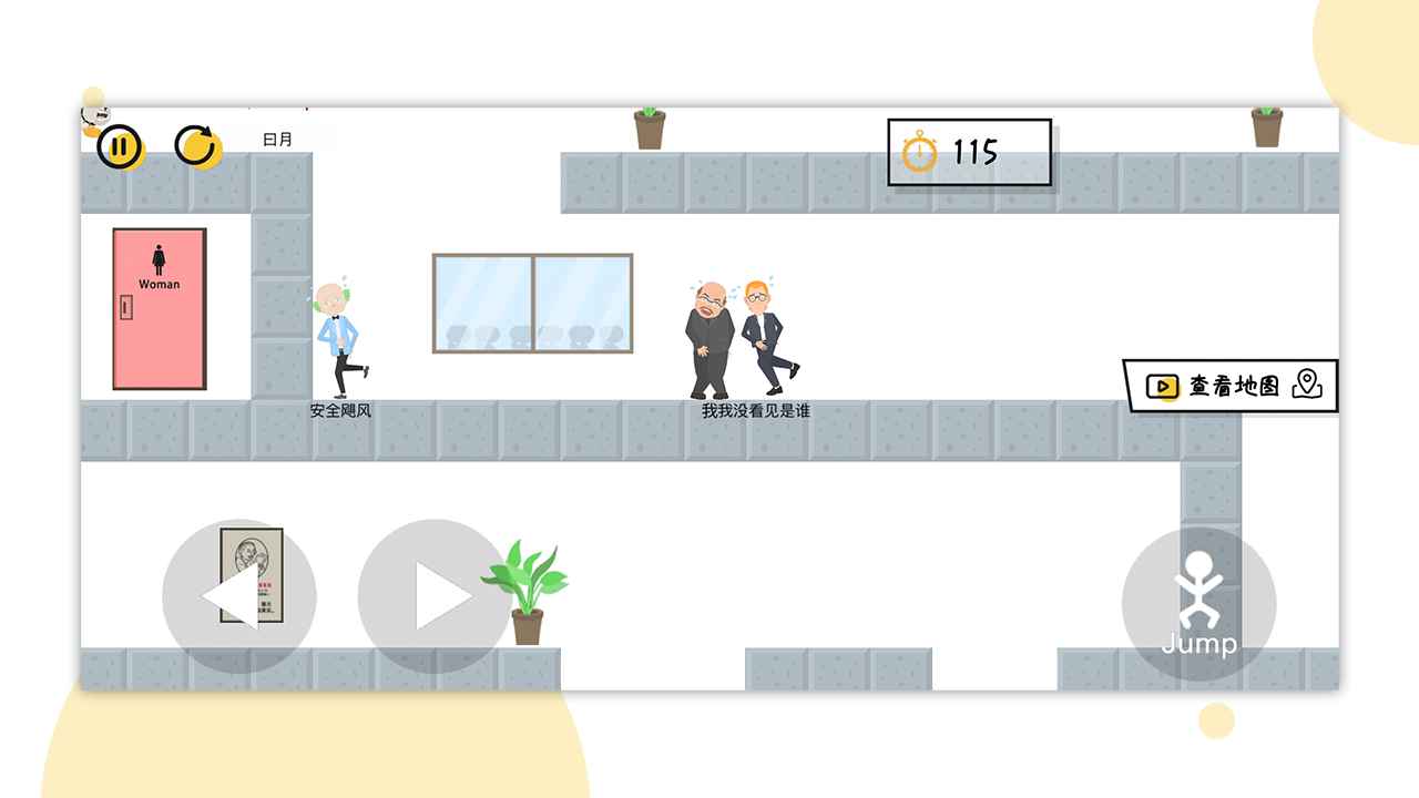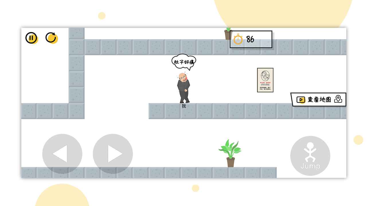 关卡的布局就像一个迷宫,可以选择观看视频来查看地图布局,建议新手玩家先熟悉基本地形再挑战更高难度;操作也是没有难度的,屏幕左键控制角色前进的方向,右键控制跳跃,掌握好节奏可以完成一些特殊动作;十分简洁的画面风格,看起来一目了然,内容非常搞笑,特别是角色憋不住时的夸张表情;如果在指定时间内未找到厕所,那么大叔的粑粑将覆盖整个屏幕,这个独特的失败动画既搞笑又具有警示作用。建议玩家多收集金币来升级角色属性,比如增加憋尿时间或移动速度,这些都能显著提升通关几率。
